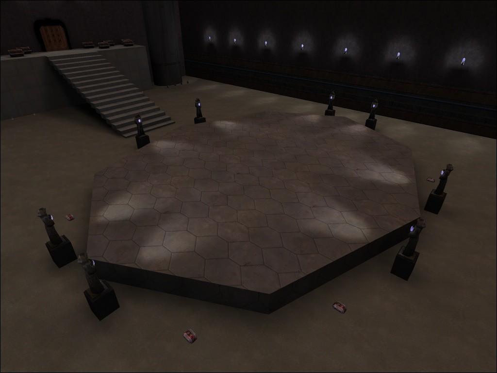 There are 4 pillars in each corner of the map and lights effect that was done by -=SotG=-Saul to make the map better - we diddnt want just a plain light effect look ;). Also there are 8 statues centering the map with lights that comes out of the Crystal shining on the surface of the polygon arena.