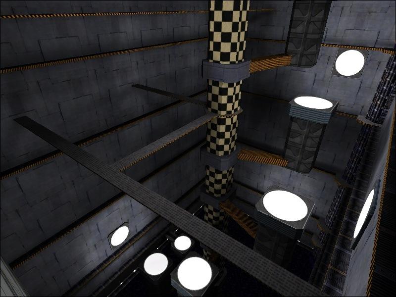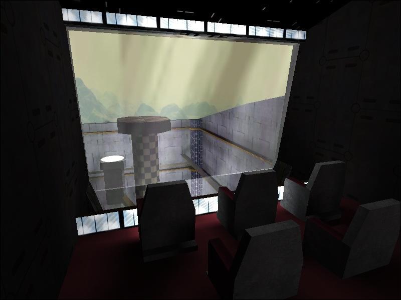 D E S C R I P T I O N: High Stakes Duel is an arena in which a fall means certain death. Make your way up to the fighting ring by force jumping up a series of platforms and catwalks. Basically the story behind this map is that some crimelords have made a business out of this arena by capturing fighters and making them fight. How is the money made? In two ways. First, the observation box, which is divided into three parts, and the two outer parts are seating for many bloodthirsty criminals (who have already been arrested and can't risk fighting, and have resigned themselves to watching violence instead). These criminals bet on the fights just as people bet on horse races. Anyone who is lucky enough to win will actually find they are not so lucky, as the greedy crimelords kill winners rather than give them money. However, there are five crimelords who sit in the middle observation box in more luxurious seats, and they are not content to split the money amongst themselves. To resolve this dilemma, they each place bets on who they think will win in the finals of each tournament. The winner takes all: Thus it's high stakes gambling!