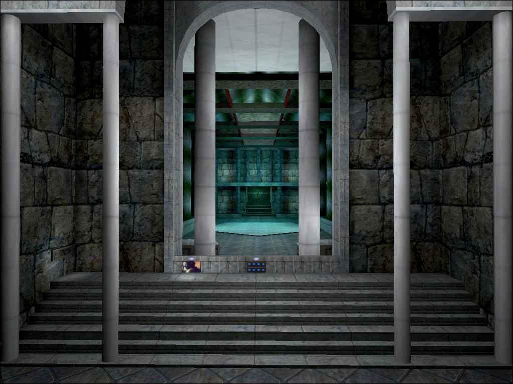 A large outdoor courtyard, with an upper glass platform, which eventually breaks, and can be replaced by a large solid platform that rises from the ground.