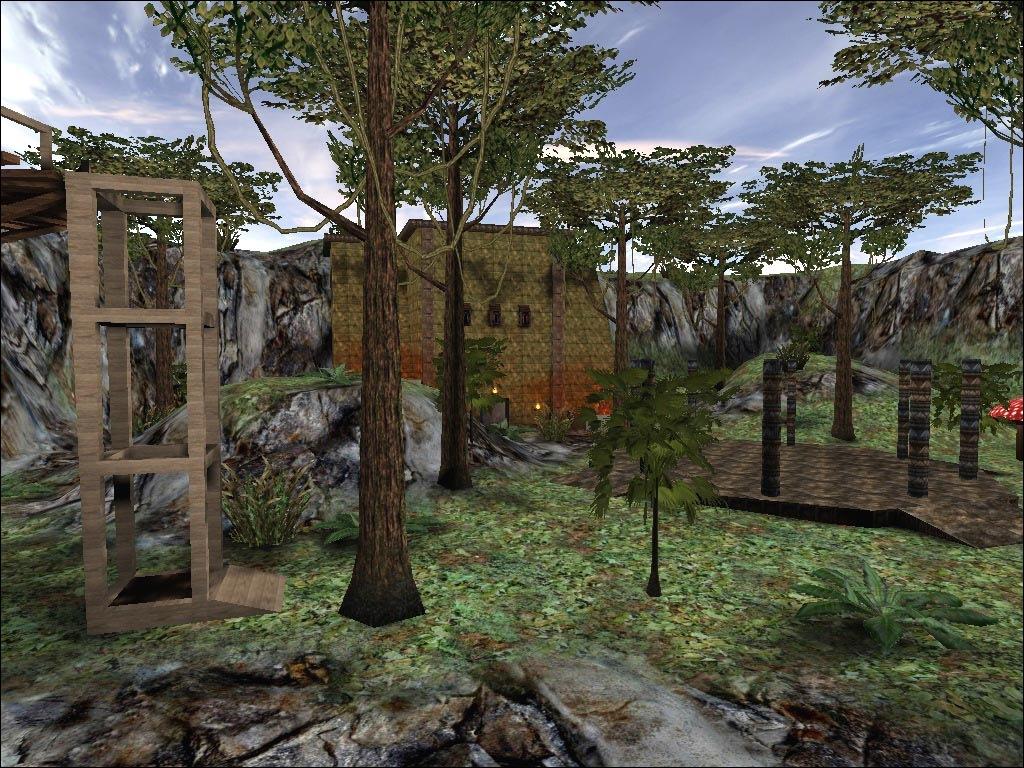An outdoor forest area containing an outdoor dueling pad surround by totem