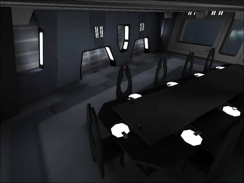This is Trade Federation Droid Control Ship from Episode I. From the things that are seen in the movie, there are Conference Room, Bridge and Docking Bay, including Republic Cruiser docked (unfortunatly, still with no interior, but i hope to make it for the next version), all conected with corridors, and something of my own imagination - a dock control station.