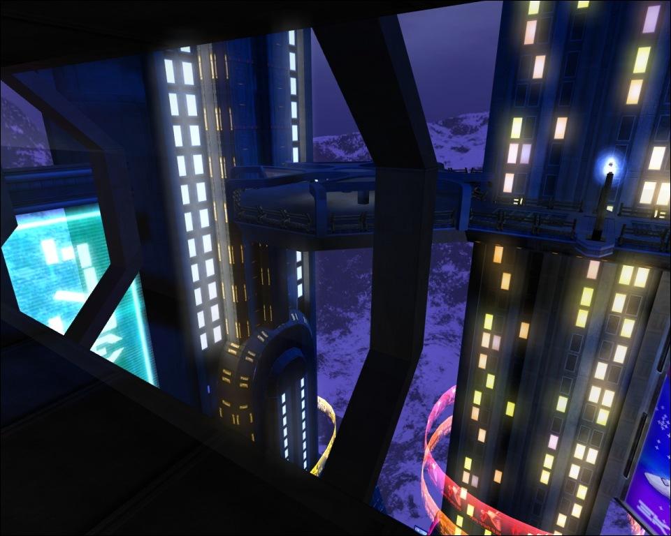 A group of skyscrapers in the mountains of Alzoc 3. Flying verhicles and