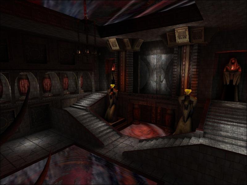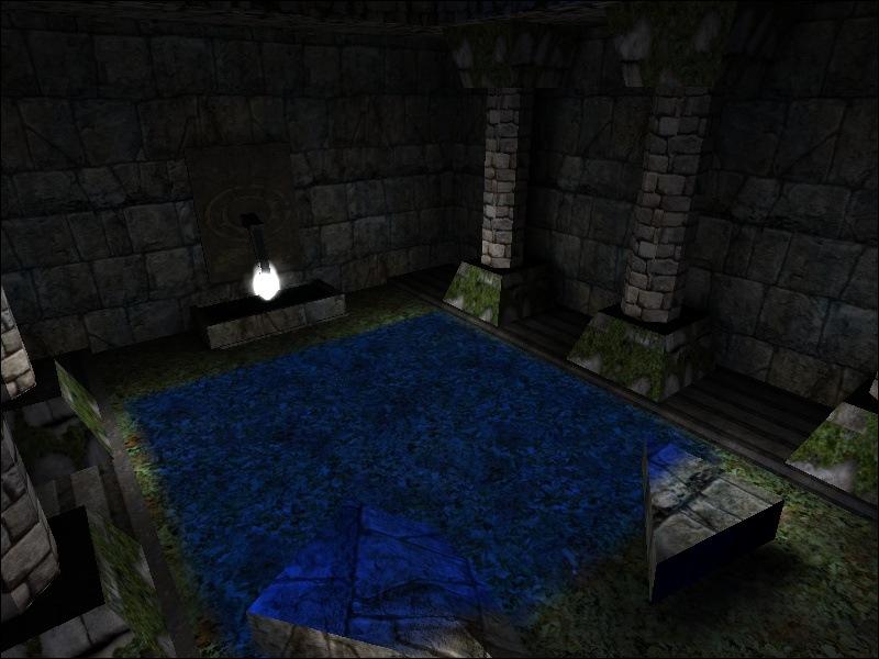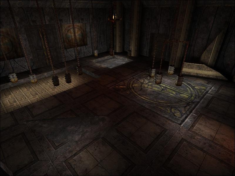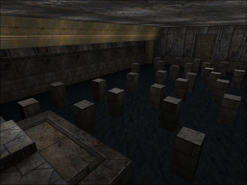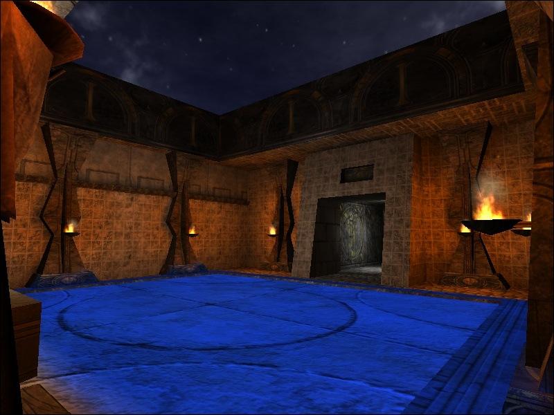 A dark temple for a dark clan ,placed in an unknown dark place, you start in a big castle hall with big stairs, all with a really dark ambient. Then you across the gigant door and you are in a corridor with two rooms, both are good for dueling, there's one with a rancor on the floor like Jabba's Palace , the other is a simple room for dueling .At the end of the corridor you can go outside , in a big square with the Dragon of JSP logo :-p , there are tree doors connected by a misterious-blue corridor, each door connect you to another 3 different rooms, one is a dueling room with a broken floor (you can fall) , another one is another dueling suite, very beautiful , and the third one is the training section , a big room with blocks to practice , and three practice doors: The laser room , The Water Block room and the Dead Corridor room, very good to improve your skills :-9.