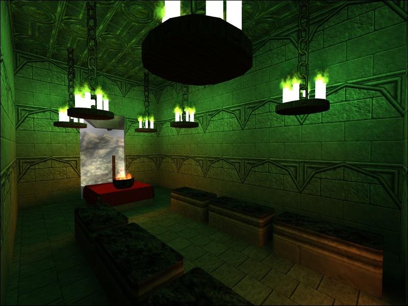 Temple. Last part of the map, here you will see that I love the green color. Candle of plateforms, great window on the exterior, several sarcophagus and a pedestal covered by a red (and black) carpet. Yeah, I know, not exactly a very sane scenary, but well... it was made to be somewhat... sick.