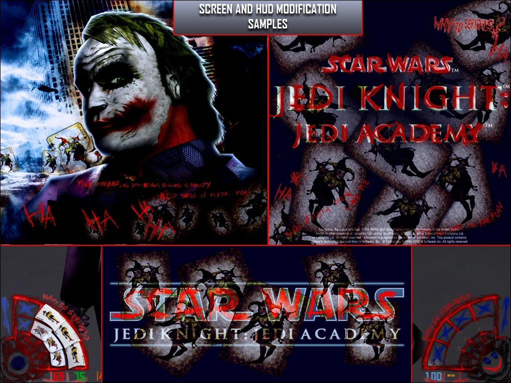 INSTALLATION INSTRUCTIONS: Put the two pk3 files in you gamedatabase folder and the jokerhudplusfix.pk3 in the JKA plus folder ( in case you want to use this pack with JKAplus, the directory usually is this "D:LucasArtsStar Wars Jedi Knight Jedi AcademyGameDatajaplus")...if you want to get rid of the hud and screen modifications delete the jokerhud.pk3 and the jokerhudplusfix.pk3.