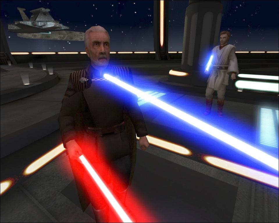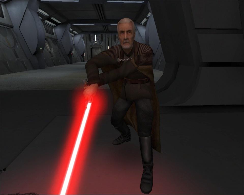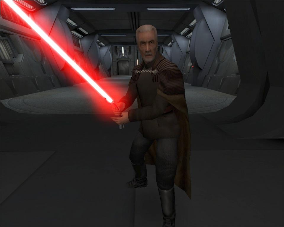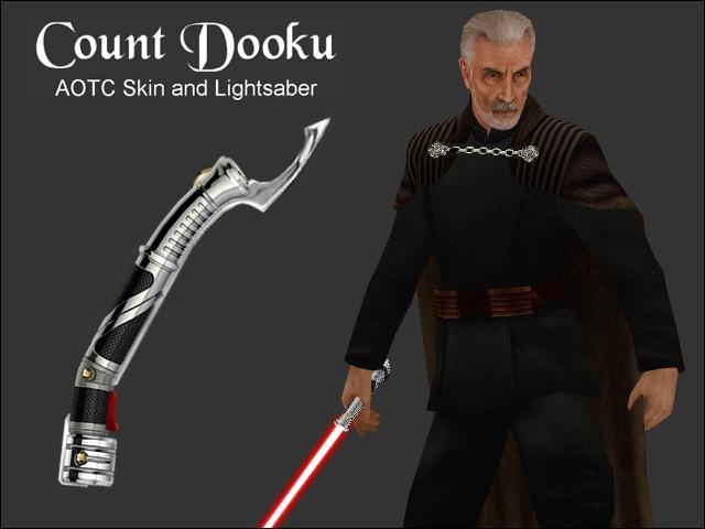 The first pk3 includes both Dooku and his saber models. There are a total of 4 texture sets in this pk3, the default, red & blue team skins, and then an alternate Episode II version (aotc). The "aotc" is only available via the console by typing