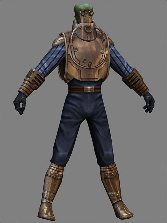 As befitting a technocrat, Wat Tambor is entirely encased in machinery and is even reliant on technology to speak. His deep, resonant voice is strangely mechanical, modulated by a set of dials built into his torso.