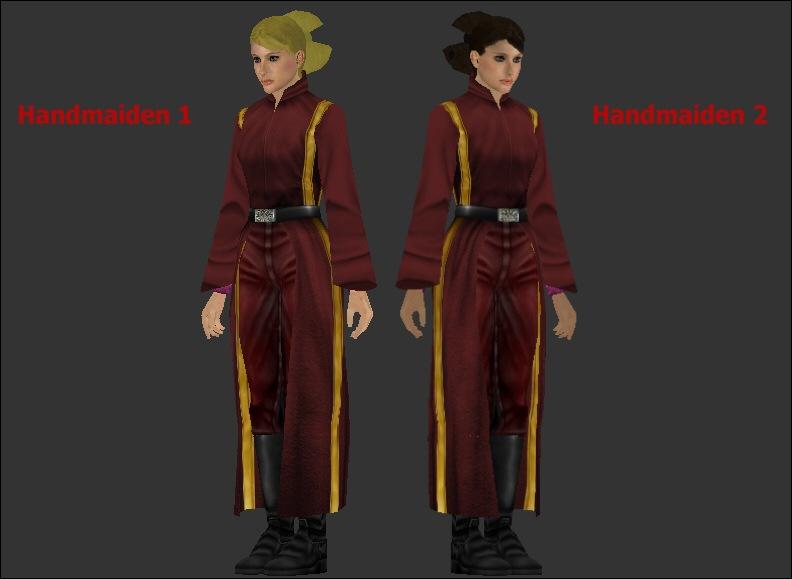 The handmaidens are basically just a reskin of Queen Amidala, except with either dark brown hair, or light blonde hair, and different faces. These models come with team colours.