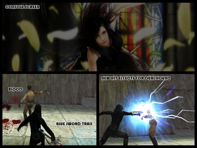 Start up screen, menu screen, console screen, map loading screen, and blue sword trails.