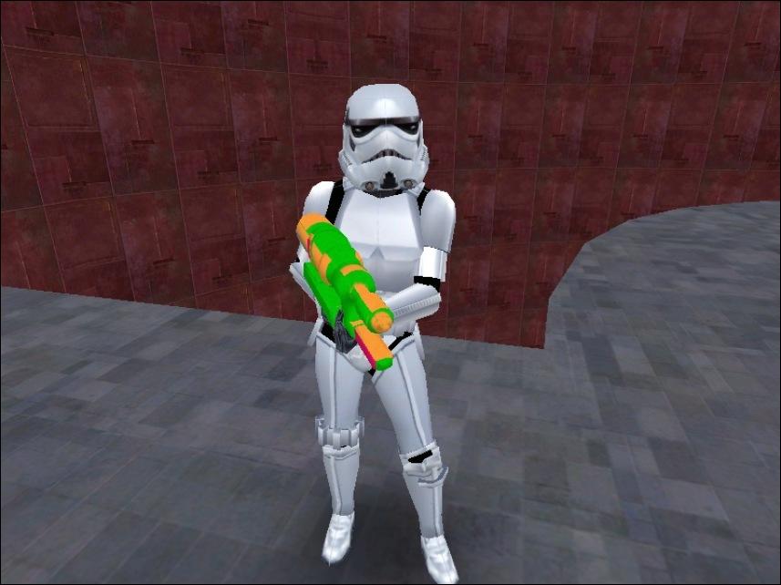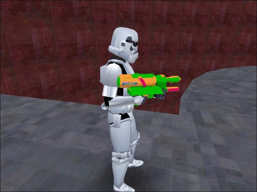 DESCRIPTION**: This replaces the E-11 blaster rifle with a super soaker based off of my own, since I couldn't find very many good referance pic's on the internet.