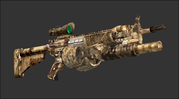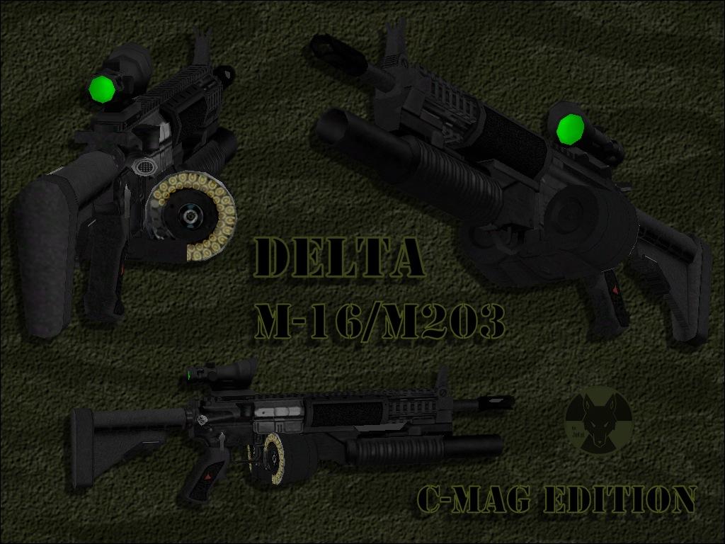 Description : This is a model of a "Delta" Version of an M-16, with an attached M203 Grenade Launcher. Also comes with fitted with an ACOG and C-Mag (aka 100 round drum magazine) and a couple of other accessories. This is a custom Add-On model for Jedi Outcast/Jedi Academy. Replaces the Heavy Repeater (aka gun 6). This was made to enhance the fun of gun play in JKA and JK2 (More guns are still on the way.)