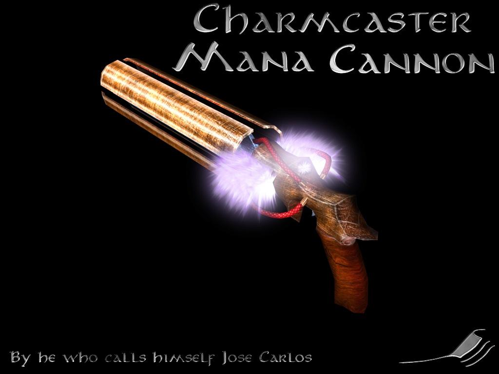 Development of a new model of mana-powered sidearms started after the Foehammer series of handheld spellguns proved ineffective against the recently awakened Vorpal Bunnies. Tadaore's Academy of the Arcane spent two years researching more effective ways of channeling the energies drawn from the Nether Region into a compressed bolt. Their efforts paid off and the Charmcaster boasts an impressive 22% increase in firepower and a decreased strain on the magistone. Excess energy is purged through vents on the sides of the gun, although the energy could also be stored in a secondary magistone located in the handle of the gun and used to replenish the mage's failing body in an emergency.
