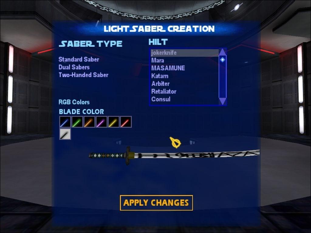 Not really hard to get this working, just go on profile>lightsaber selection and pick masamune.
