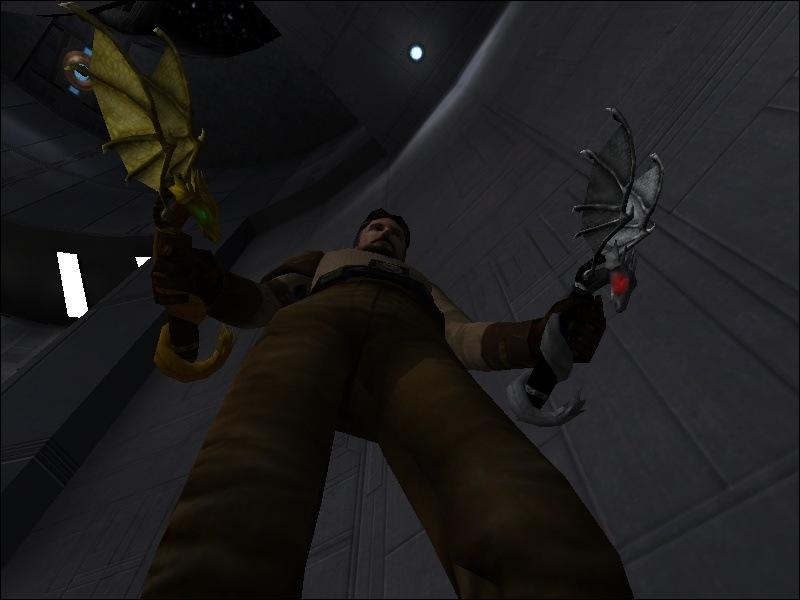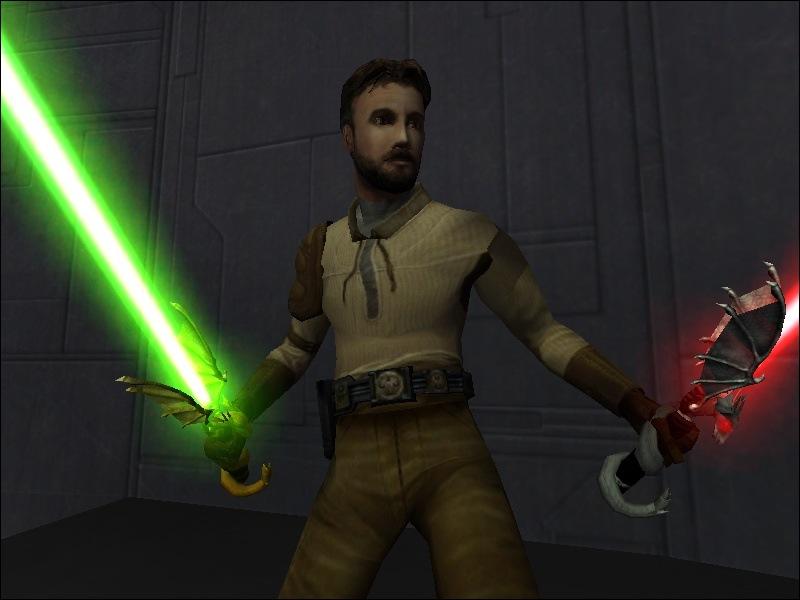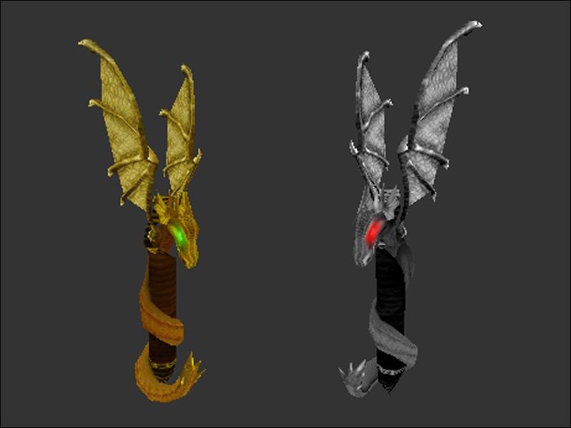 DESCRIPTION: The first mod i have finished and released, i have heaps of incomplete projects on my hard disk, so i decided to finish one for a change :P. Here we have two versions of a lightsaber hilt i designed, a dark one called Wyrmclaw and a light one called Ormrclaw. The model is based on a dragon, i wanted something that could really stand out among other saber hilts and i think the wings do a great job of it, see for yourself :). This was modelled and UVW mapped with gmax and textured with Photoshop.