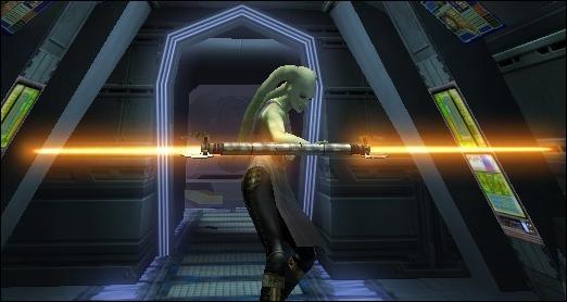 To begin the SP campaign with the double-helix saber, left or right click on the saber hilt name in the selection menu (right click is faster in my case). Even though the saber selection menu is restricted to single-bladed sabers, the dual-bladed helix saber hilt will appear (no, this does NOT mean that under normal circumstances you can dual wield dual-bladed sabers. That is just...insane).