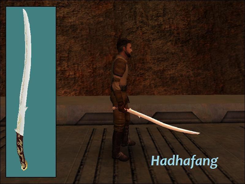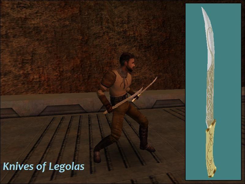 DESCRIPTION: This is a pack of some elven weapons from the Lord of the Rings movies. It includes two swords and a knife: Hadhafang, Arwen's sword, the high elven sword that random elves used, and Legolas' knife. All the textures are original except for some of the gold inlay on Hadhafang--have you ever tried to make something like that with a touchpad?! Don't answer that.