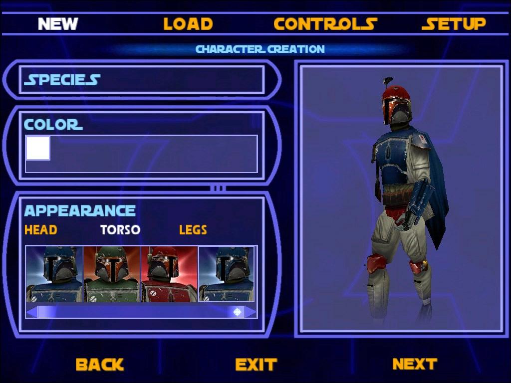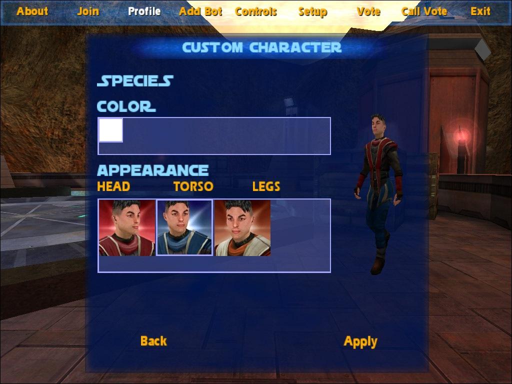 Each playable model has been given SP species support so that all default, red team, and blue team heads, torsos, and lowers are mix'n'match. This works better on some models than others, naturally. This is available both as a SP mod, to select your favorite default model for SP play, or you can also use it to customize your favorite model for MP play by using the species menu (I like a half-blue half-red Boba Fett, myself).