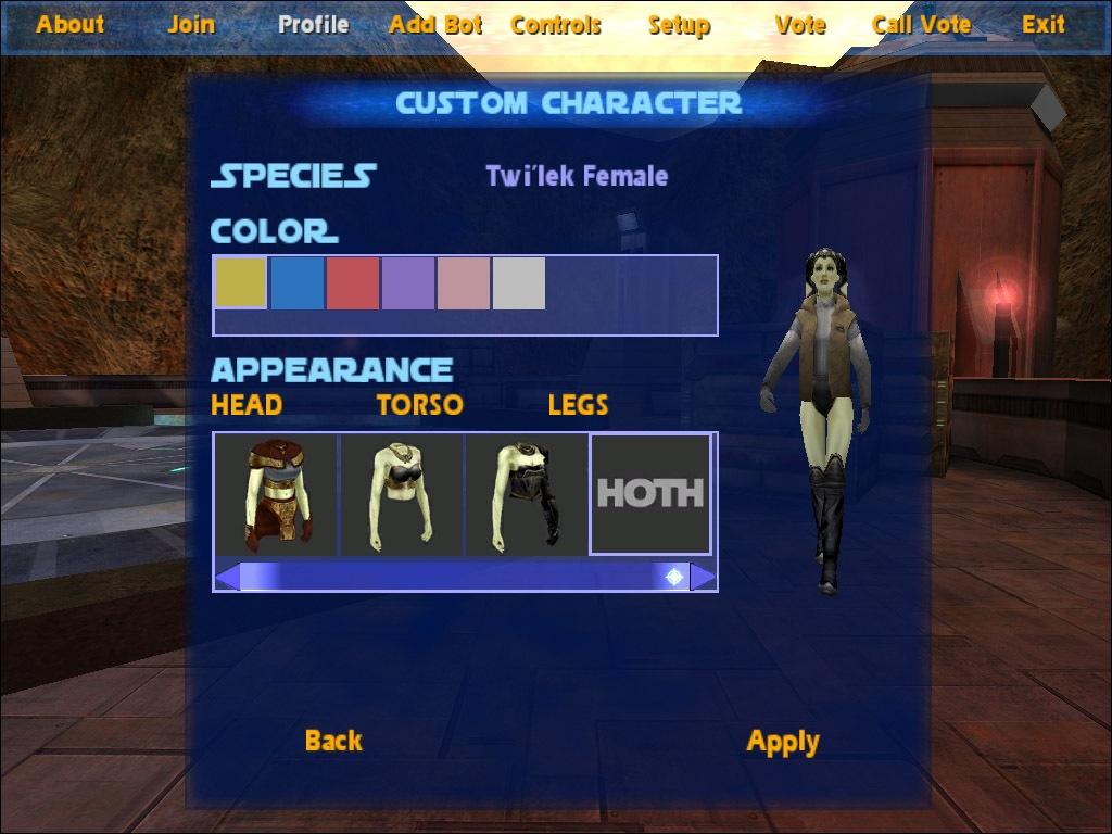 This mod adds species menu support for all base assets playable models from Jedi Academy.