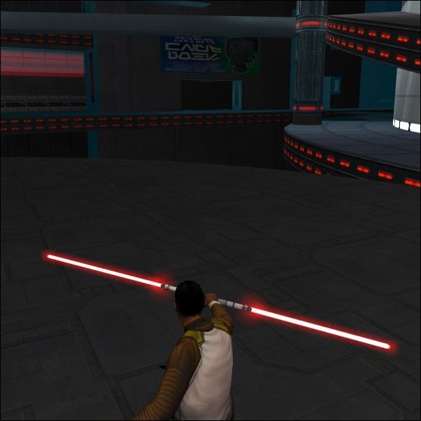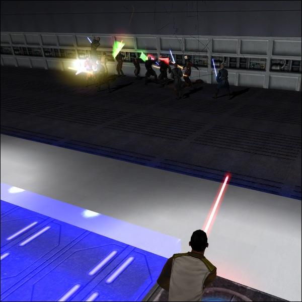 As with the sound mods, there are an equally large number of saber blade mods to choose from. A few of them came close to what I considered "film" style blades, but whereas Jedi Academy's blades are too gradiented (is that a word?), the blades I've seen so far are too stark. These blades alter the lightsaber tips to be rounded (as they were for the most part in the OT) and provide solid white cores with just a dash of fuzziness on the sides so that if you're like me and you use antialiasing, you won't see jaggies in the blade.