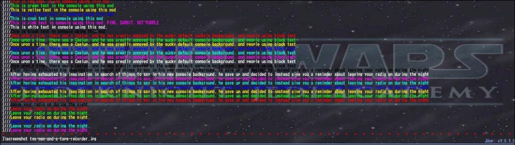 DESCRIPTION: This is a simple mod that makes the console go grey without getting rid of the starry background. I figured I'd make one after noticing there wasn't one on jk3files.