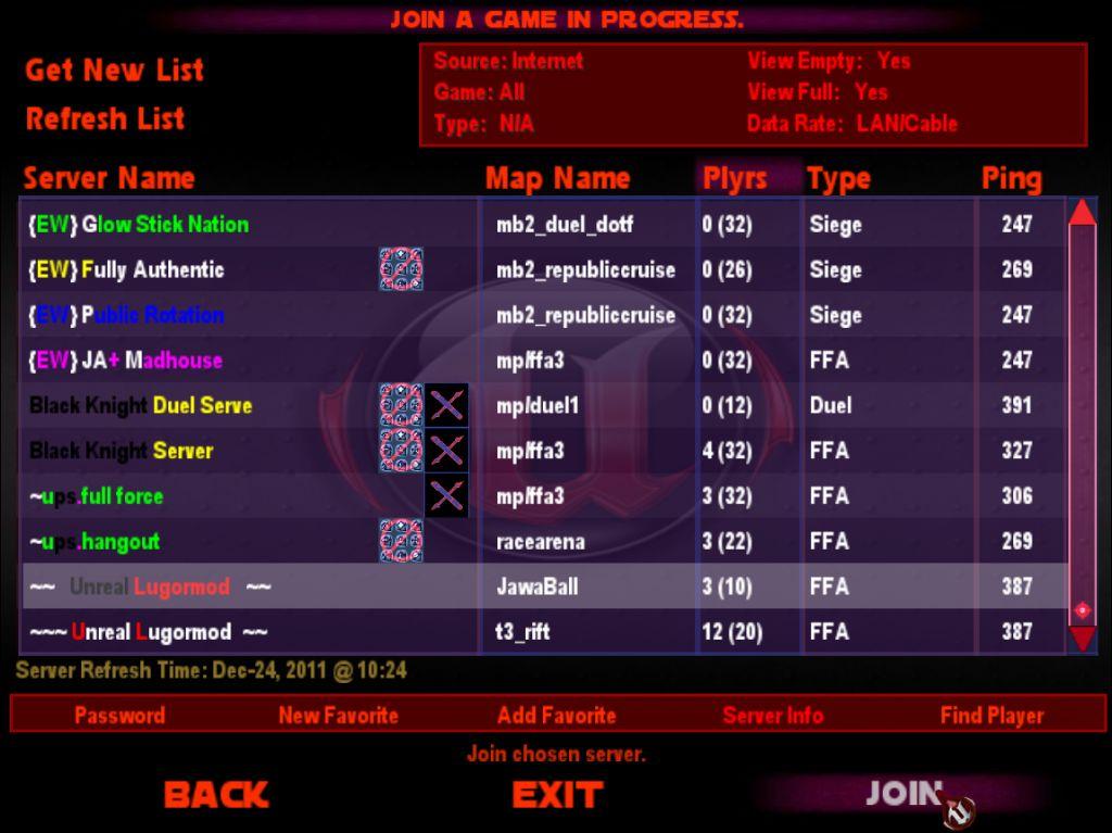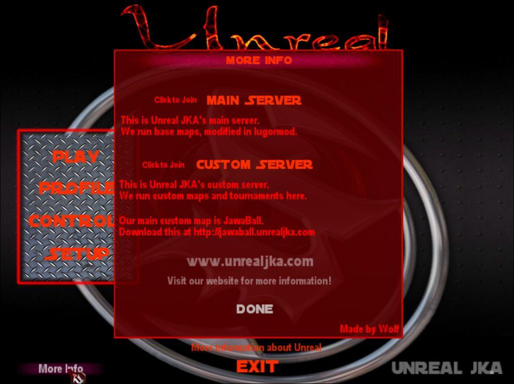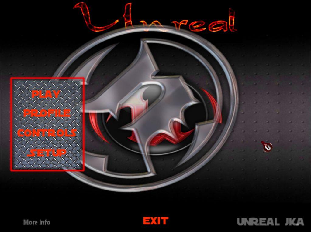 DESCRIPTION: This is a complete User Interface overhaul for Jedi Academy. Splash screen, main menu altered, colour theme changed on every single page to a dark/red feel. Console and menu shaders have been edited, lodaing screens, ingame HUD, etc. As this is made for the clan 'Unreal', Our logo, and the unreal tournament logo (which we claim no authorship over), have been placed a few times.