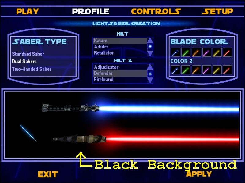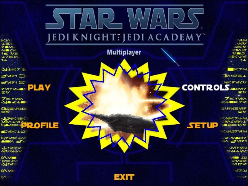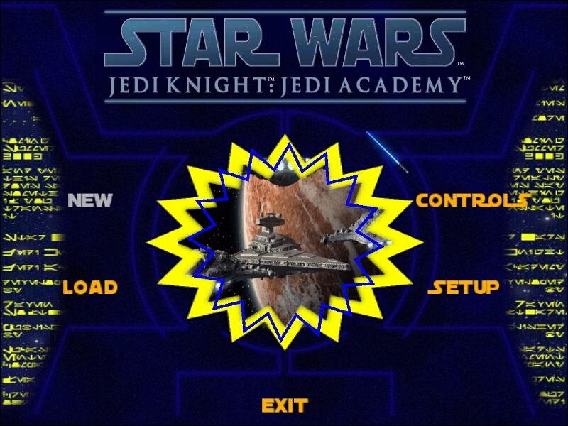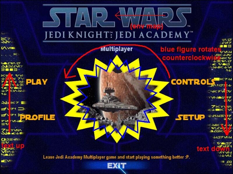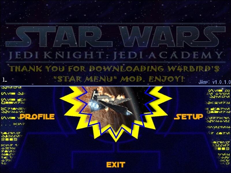DESCRIPTION: New Main Menu layout. I'll try to describe all details. Rotating ring is replaced by rotating counterclockwise star and there is no grid, only star figure. Text in 'Aurabesh' font in the left and right is recolored to yellow to fit better to it's 'star' background. Default .roq video is replaced by video, which shows 3 rebel ships fighting ISD. Also text in the right is scrolled down, so left goes up, right goes down. Main buttons' background is removed. Quite unnoticeable, but still it is - new environmental map (stars) scrolled through JKA logo. In SP mode, there is now music in menu. Also, a few subtitles, when highlighting 'EXIT' buttons are changed (SP and MP) as well as their sound (SP and MP). Almost forgot, mouse coursor is from Jedi Outcast - lighsaber pointer + JO menu sounds. Ah, and saber menu's background is changed to black for better saber blade<->background contrast (SP and MP, as most changes). Also, console image has been changed. That's it. I can only hope you enjoy it.