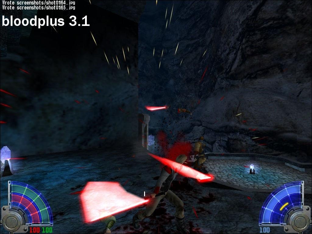 3.1 - a move toward smaller textures that spurt more often. More diversity within the sprites themselves and a trend toward more splatter but less red (less ground coverage). Same amount of dismemberment. Added tails (for us nerds who know what those are) to go jetting out on saber hits and paste small bits of gore wherever they land. The downside is that with so many more images getting drawn everywhere, the game erases old sprites in order to let the new ones land, so sometimes it looks like the blood's evaporating wicked fast as new blood lands on the ground. For this reason, 3.1 may be more suited to single player, when there tends to be more time between killings. The sounds in 3.1 are a bit less splooshy and more splattery.