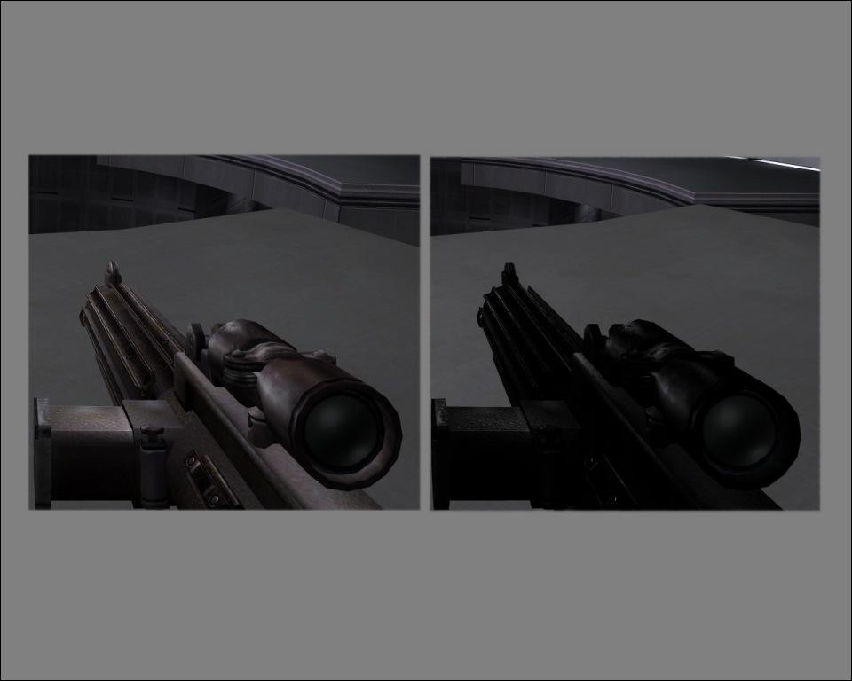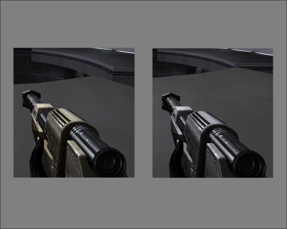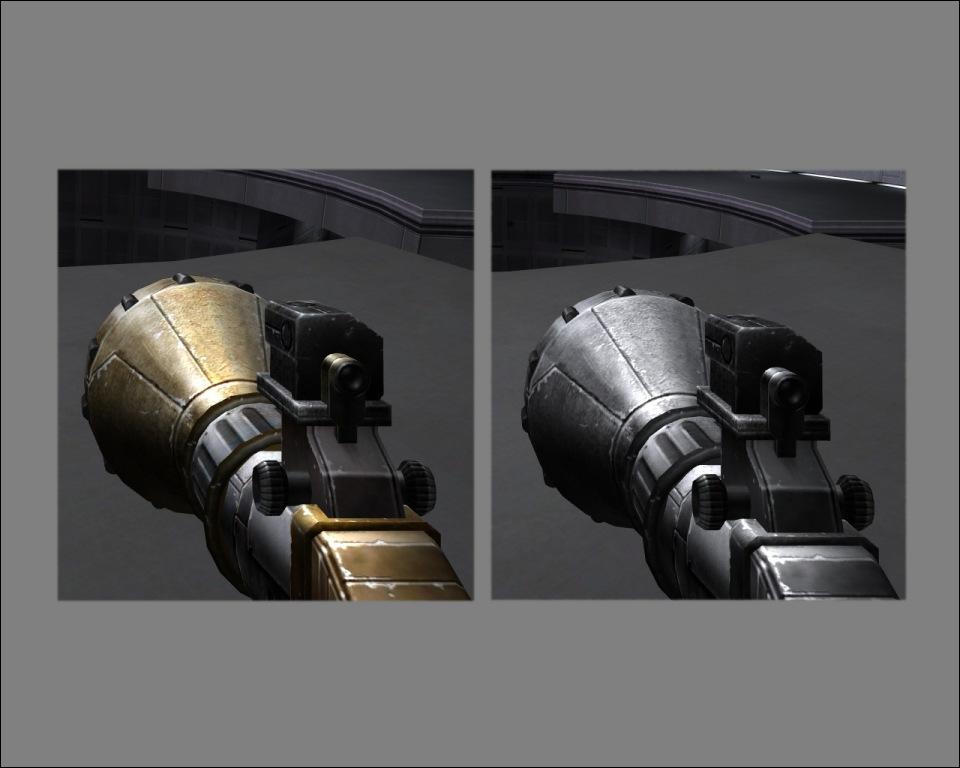 Description: For some reason Raven decided that it would be cool to take the E-11 from Star Wars and make it light brown instead of black. Raven also figured that while they were at it they had might as well make all of the other weapons tan instead of black or grey like metal usually is. So I made the Disruptor silver, the DEMP 2 gray, and restored the E-11 to its former glory - black. Enjoy the mod!
