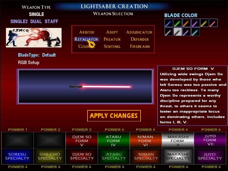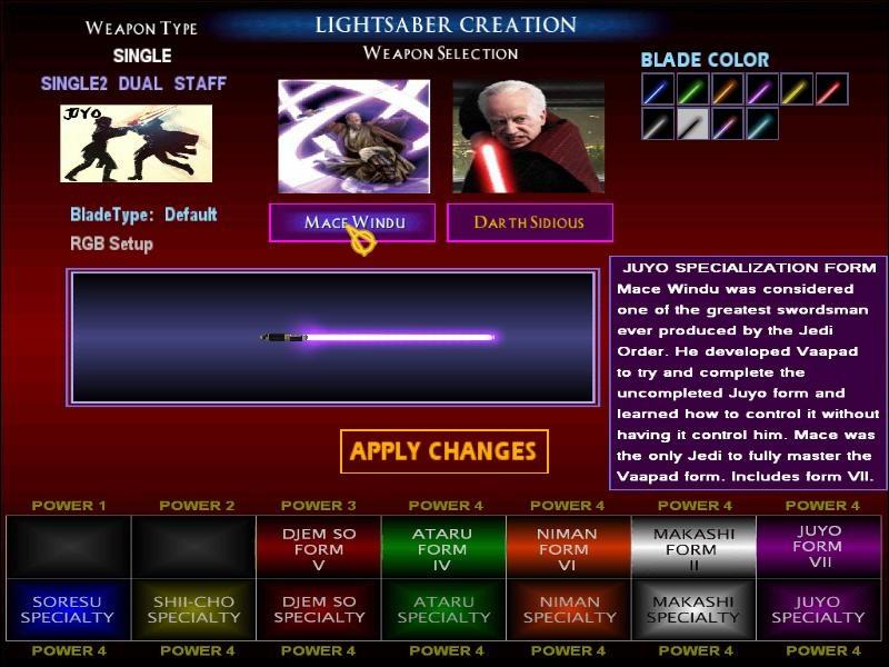 - 7 Forms of Single Saber Combat: These are represented in the mod; Shii-Cho, Makashi, Soresu, Ataru, Djem-So, Niman, and Juyo.