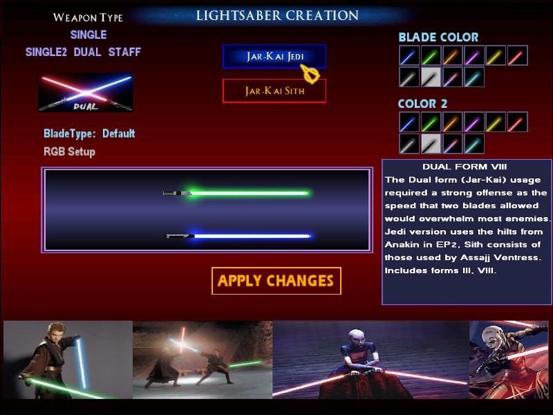 - Jar-Kai (Dual): is represented in either Jedi (Anakin) or Sith (Ventress) Hilt selections.