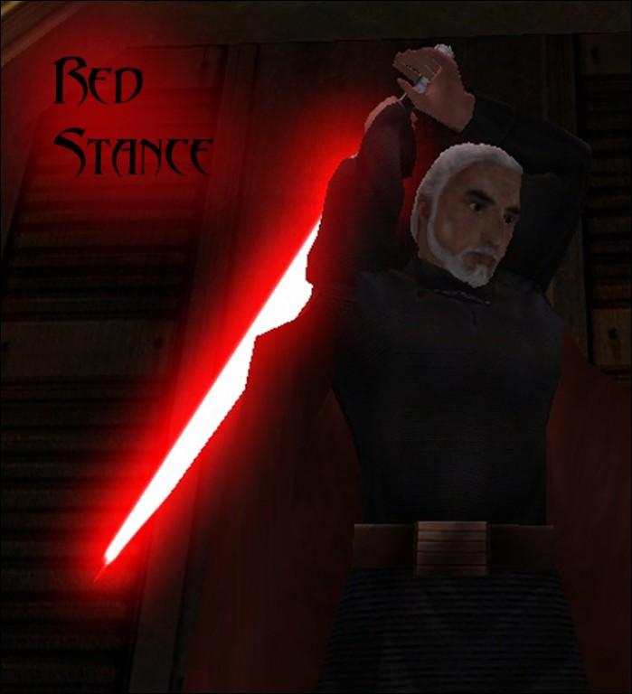Red: (Form II or Form V) : My favorite stance, the aggressive stance used by Anakin and Dooku in Episode2.