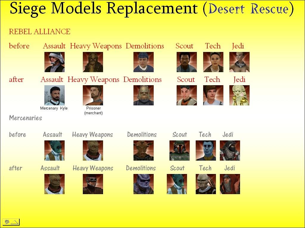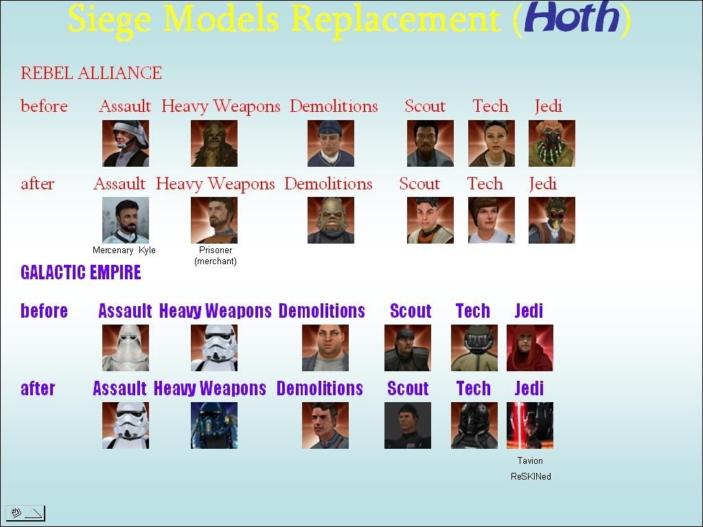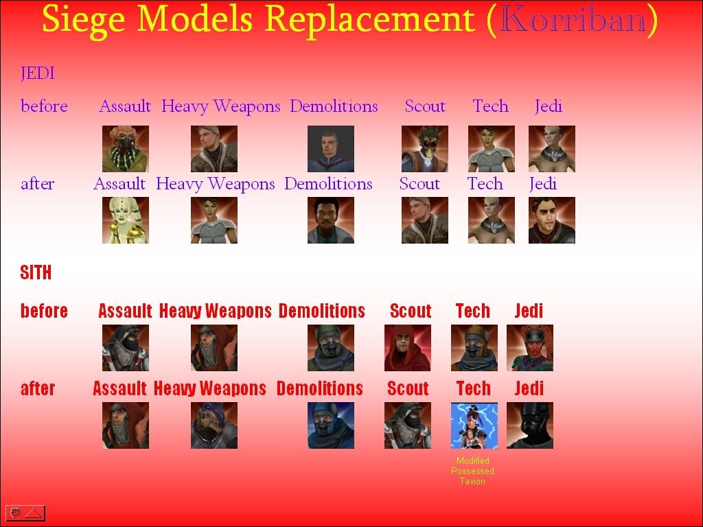 DESCRIPTION: This mod replaces default models used during siege gameplay with this ones -> as shown on inluded pictures. Mostly they're Raven's models, but I also allowed myself to include three models of my own: Mercenary Kyle, Modified Possessed Tavion and Tavion ReSKINed. Some of the models have changed saber blades colors, e.g. Jedi Guardian in Korriban have two-handed saber with blue blades instead of default green, etc, etc. Hope you like this little change from default boring and overused (and overseen) models. Enjoy!