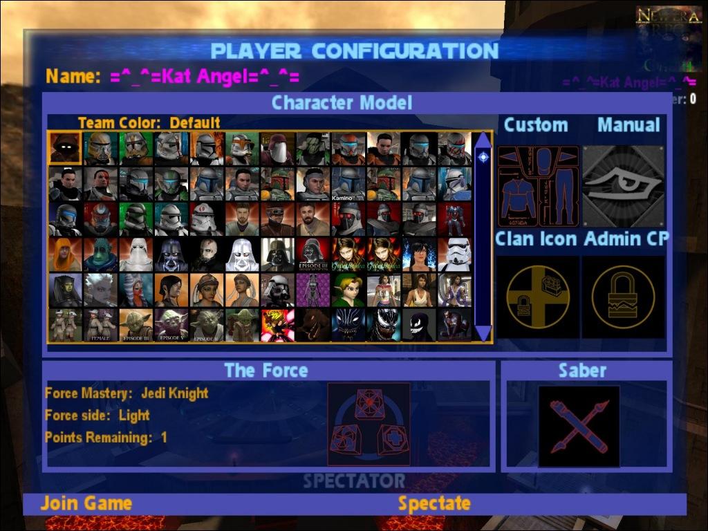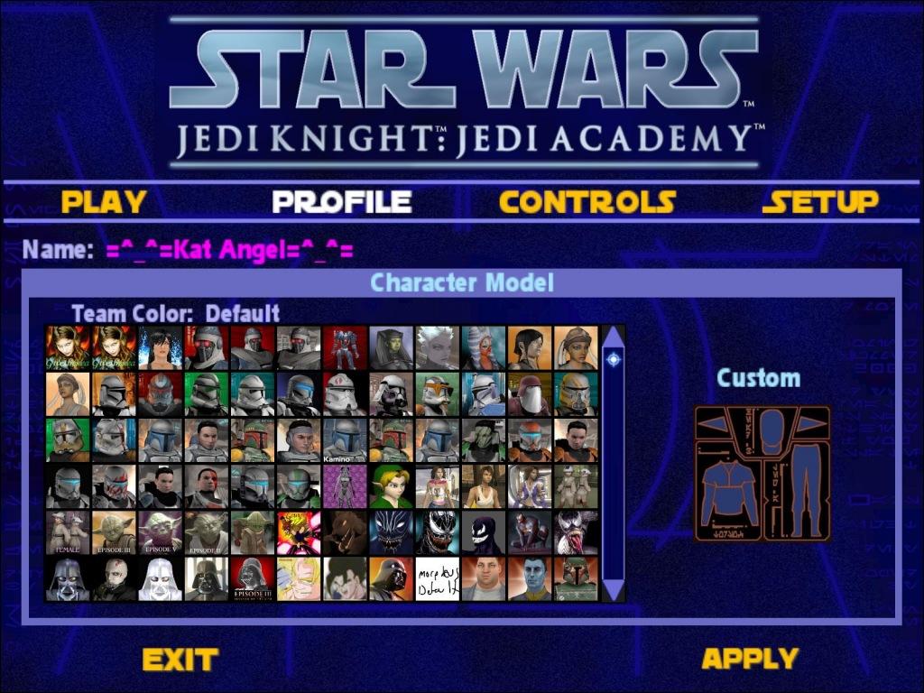 Finally, I'm obliged to state that I am not affiliated with LucasArts, Raven, Activision, or any other company affiliated with Star Wars: Jedi Academy, and this mod is neither supported nor endorsed by any of the so mentioned entities. Star Wars, Jedi Academy, and all related trademarks belong to their respective companies, all rights reserved.