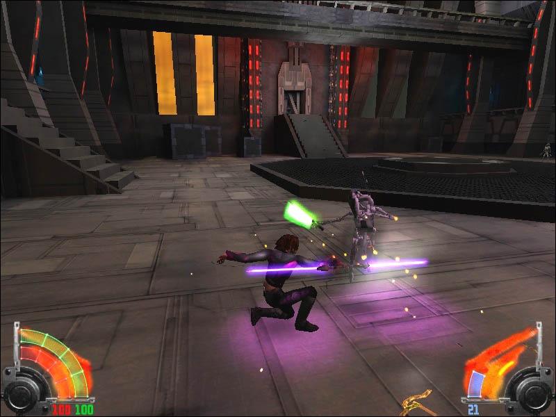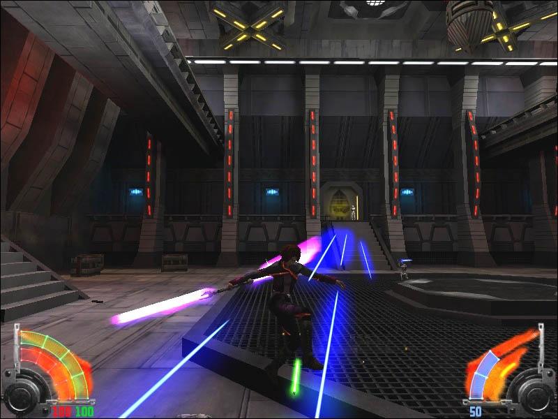 The playing arena is set on a distant planet not too disimilar from Geonosis. The general theme of the map is that of a power station built into the back of a huge factory. My intention was to have some of the factory explorable and would of looked similar to the geonosis droid factory but there was no real point cos you couldnt have a decent fight on a conveyor belt if ya know what i mean so i decided to remove it. The main "map" in the mod isnt realy one map but several each one cut down to improve framerate for each game mode/character.