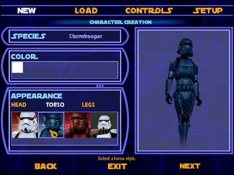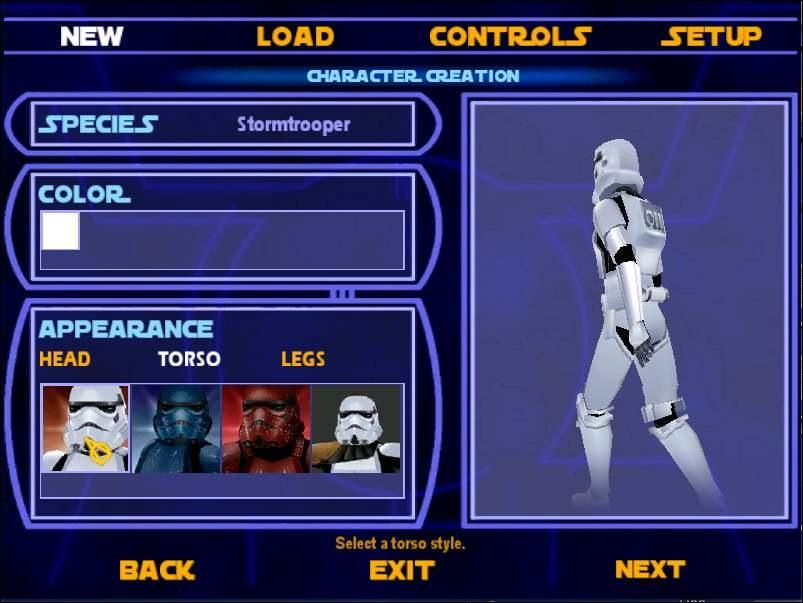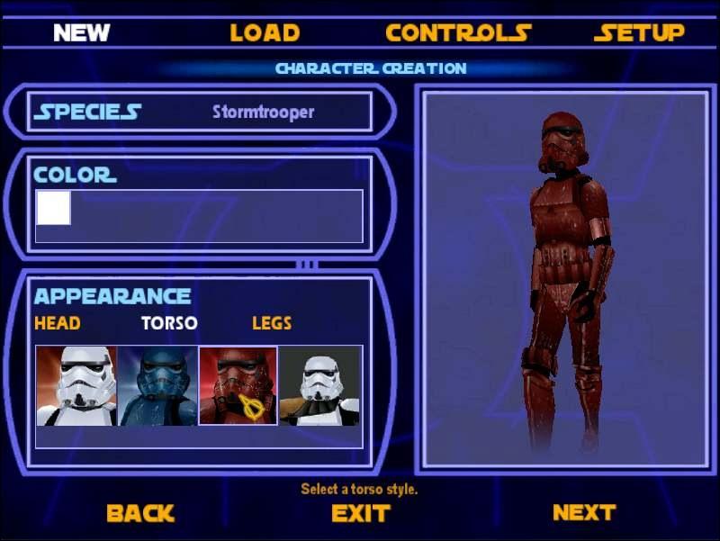 DESCRIPTION: This is a mod that allows you to play as four different Stormtrooper models in Single Player. To change your Stormtrooper, simply change the torso. Also, no matter what Stormtrooper you play as, you will be turned into a blue Stormtrooper officer for the Hoth level.