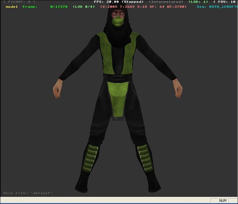 DESCRIPTION: This is a skin of the characters Reptile, Subzero, and Scorpion from the Mortal Kombat games that uses the Reborn model. The default skin is Reptile (green). Blue team skin is Subzero (blue). Red team skin is Scorpion (yellow, but who cares!). If you look closely on the right palm of the Scorpion skin, you will notice a little silver blob. That is supposed to be his little hook line thing. You can see it pretty well when you use saber throw. No new sounds, and no bot support!