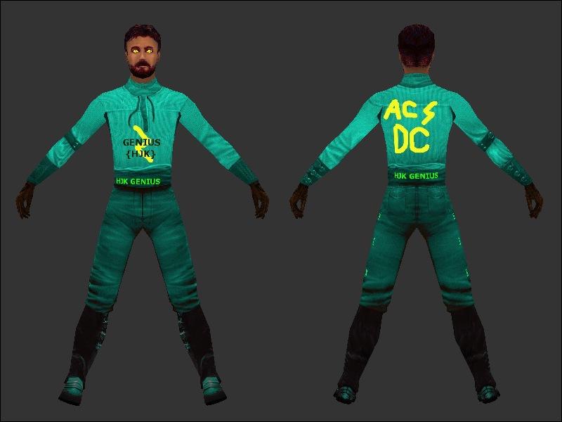 DESCRIPTION: This is my first skin. It's not good, and it's made and personalized for me, but it has bot and npc support, and I did it all in a week. It also has new sounds. It looks like kyle, but it's not. The shirt and Pants are green, the belt says genius on it, the shirt says AC/DC. The pants also say HJK on them, which is my clan. The eyes are yellow, and it's all around good.