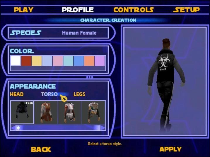All the torsos are torso_fear1, and pants are lower_fear1, to avoid any problem with other mods