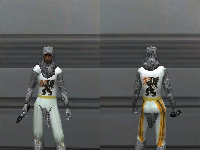 There are 4 variations of this skin, the default (accesible through the profile menu picture sun), the blue (accesible through the console, "/model medievalknight/blue" without the quotes), the Falcon crest (accesible through the console, "/model medievalknight/falcon" without the quotes), and the Griffin crest (accesible through the console, "/model medievalknight/griffin" without the quotes).