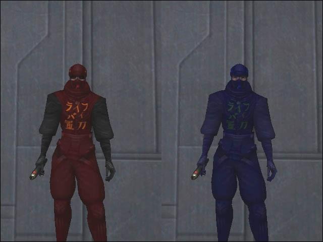 This is version 2, I�ve read JediOfOne�s review of my previous skin and changed the sleeves and hands of the blue skin, I�ve made the writing on the clothes dimmer on default and blue team, red team is basically unchanged. I learned how to make bots and NPCs soon after finishing my Ron Burgundy skin, so Version 2 has both. This pk3 includes 4 NPCs� Ninja2, which is a normal, player friendly ninja, Evil_ninja2, which is the same as the first only it will attack you and the first NPC, Blue_Ninja2, same as the first NPC only it uses the blue Ninja Skin, and Red_Ninja2� which is the same as Evil_Ninja2 except with the red team skin. The NPCs are lightning quick and spawning 5-10 Blue_Ninja2s and then 5-10 Red_Ninja2s can be fun to watch. This is most likely the final version.