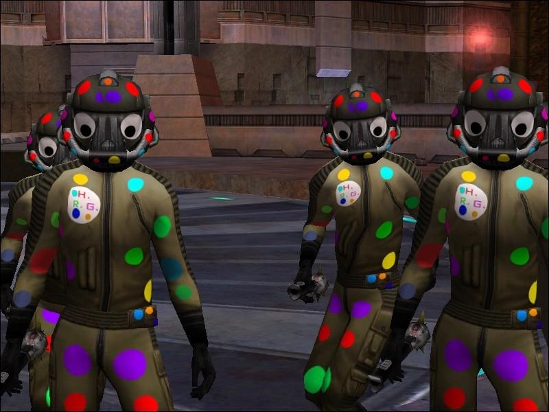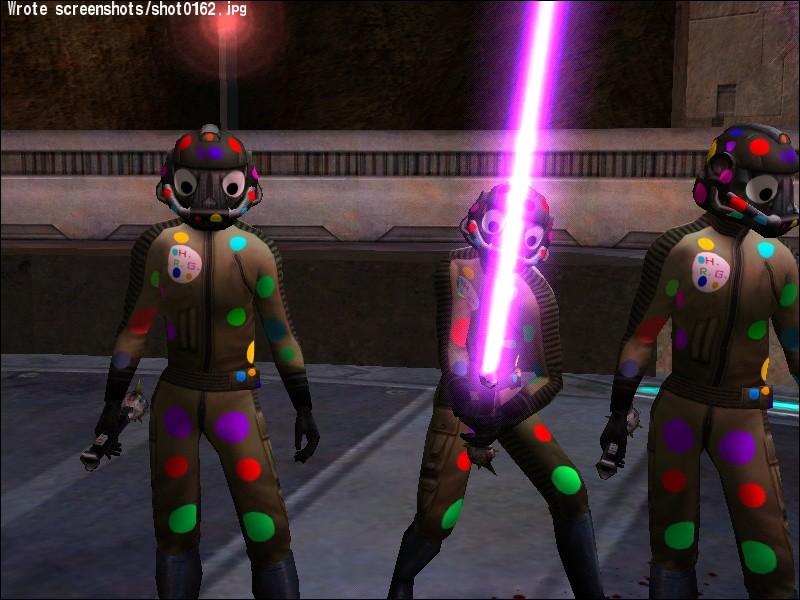 There are two(2) .pk3s. The Happy Rainbow Trooper that replaces the Imperial Worker[happyrainbow_replace.pk3], and the Happy Rainbow Trooper that has it's own npc[npc spawn happyrainbow], bot[Happy Rainbow Trooper], and multiplayer character[model happyrainbow]. This file is the happyrainbow.pk3. I did this because it might be fun to play siege with Happy Rainbow Tech running about!:)