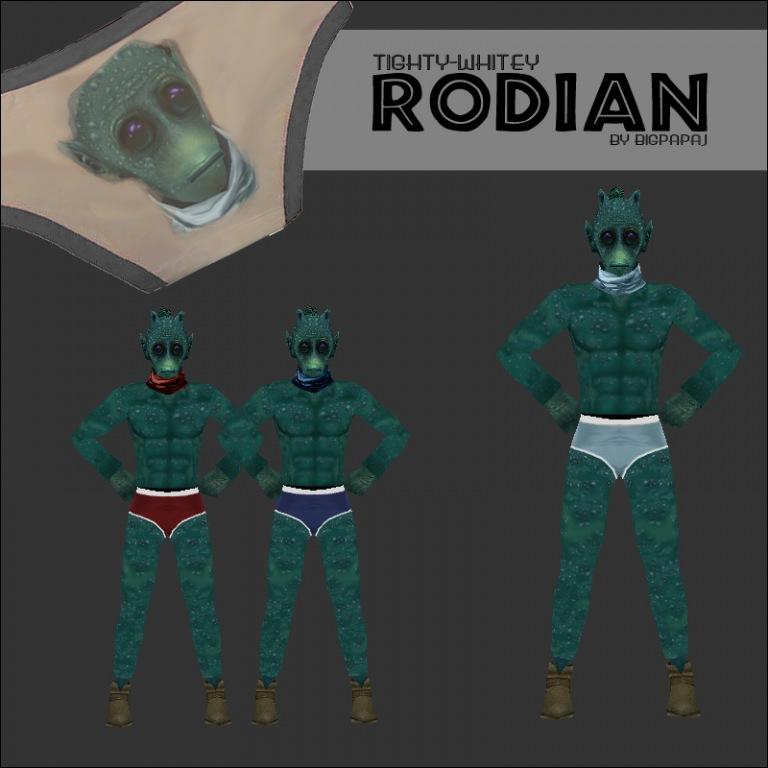 Skin's description : A customized version of a standard Rodian. The only difference is that rodian is wearing nothing but his boots, his collar and (you guessed it) his "tighty-whiteys". The skin on the body that you wouldn't normally see on the rodian is made up of a collage of layers taken from the rodian head (resized and rearranged of course). The detail is not much to talk about, but this skin was made more as a joke and not to be viewed as a work of art. Enjoy!