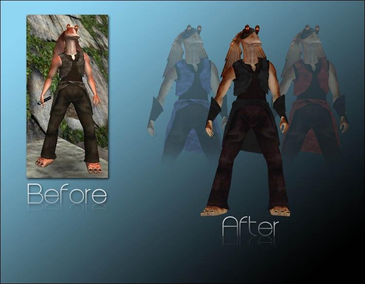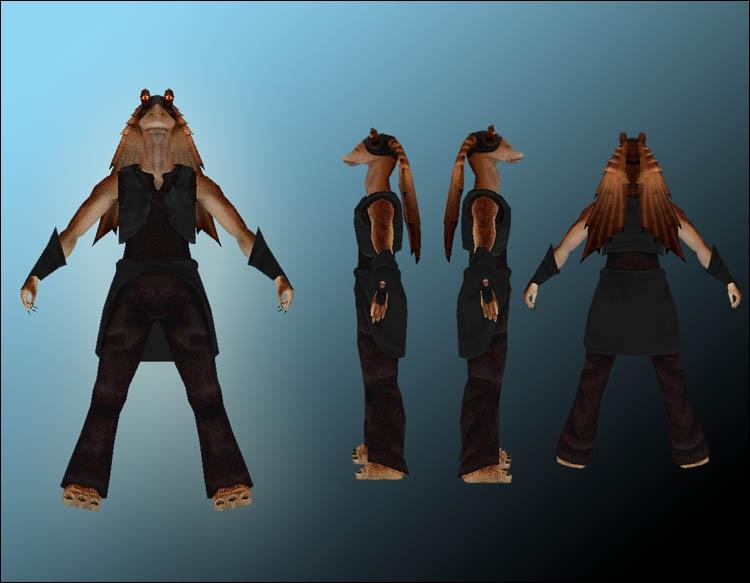 DESCRIPTION: Well, This is a sith version of a gungan ^_^ I changed alot of stuff, like his eye color, skin tone and little black spots here and there, put on the hat and gauntlets, changed the textures a wee bit. So yeah, Enjoy ^_^