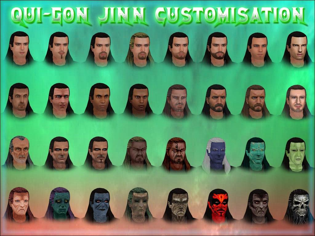 Sevaral face textures are extracted from the jedi_customisation_plus by SPANKI, but I made some myself of course. Easy, maybe you think? Not really, in fact. Of course the glm Model is not the same, and I had to work hard to adapt it on the Qui-Gon Jinn model.