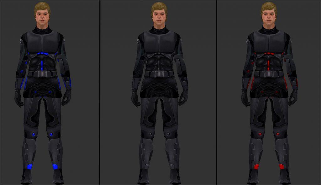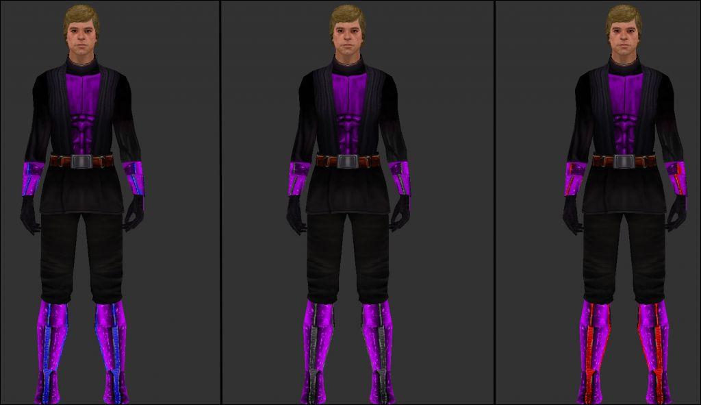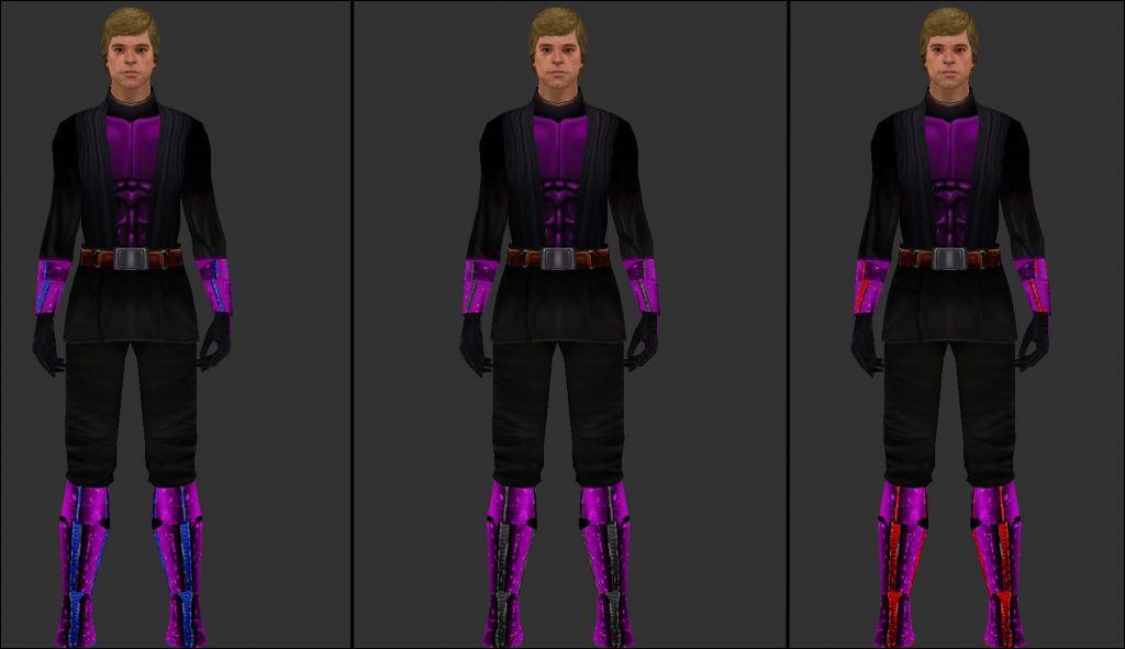 with different colors: White, Blue, Green, Purple, Pink, Black and Red, as well as a full armour