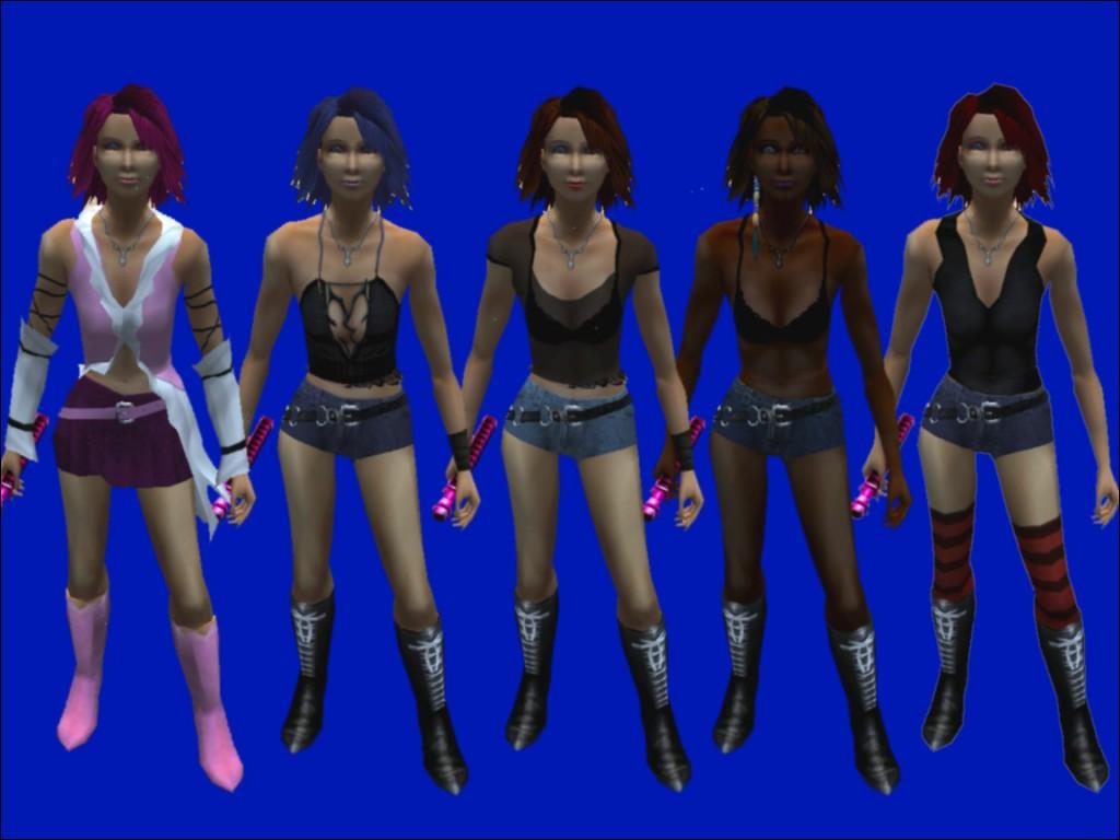 - Flora -> Brown hair, Black Bikini top and Black shoes, Short Blue Jeans