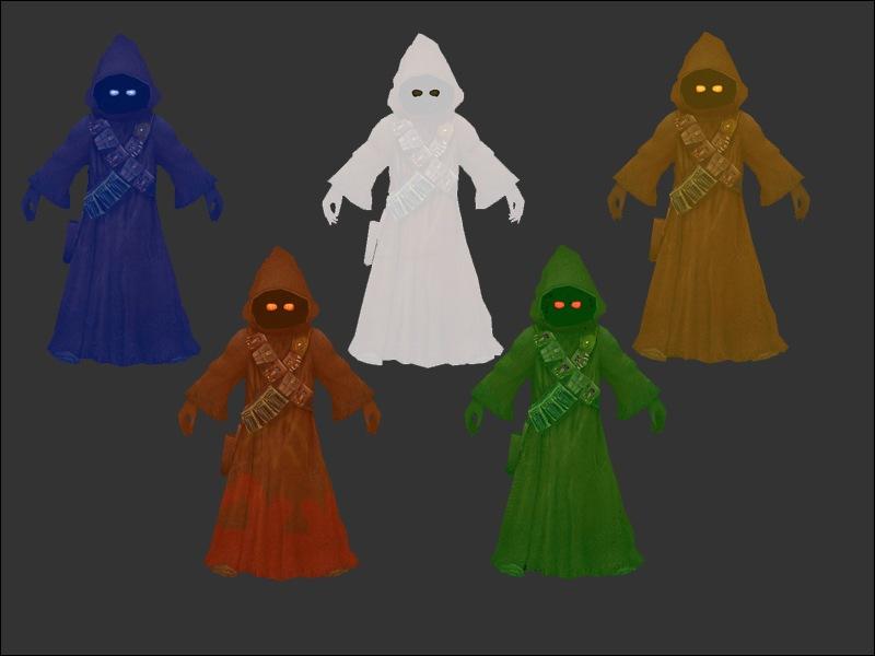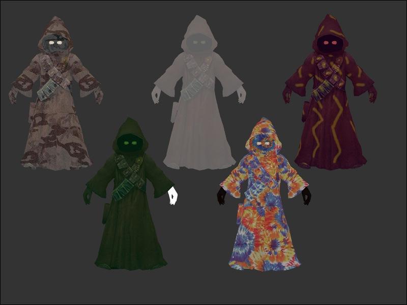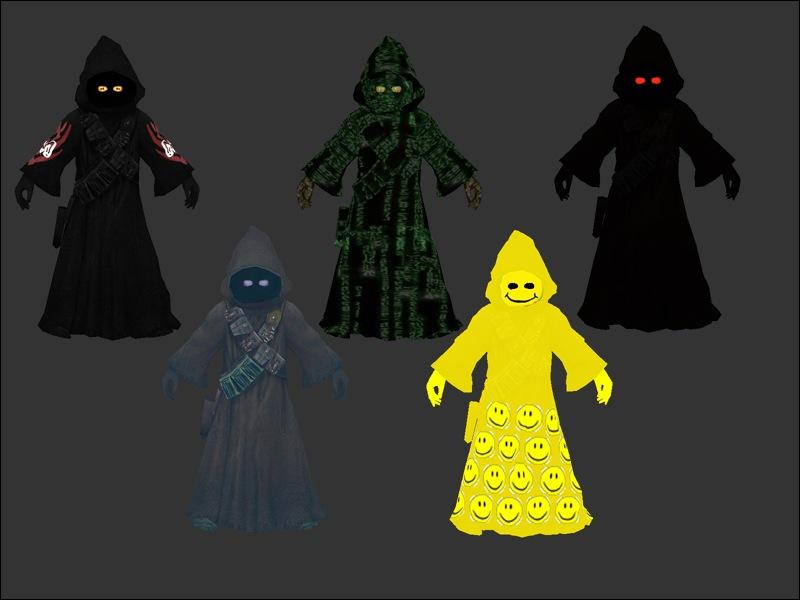 Ghostjawa - wanted to have one more skin before releasing v2 and i was watching tv and it was a halloween episode of something on and there was a kid in the cleche bedsheet with 2 eyeholes punched out for a ghost costume. and there was my inspiration. a white jawa skin with black eyes representing the holes in the sheet.
