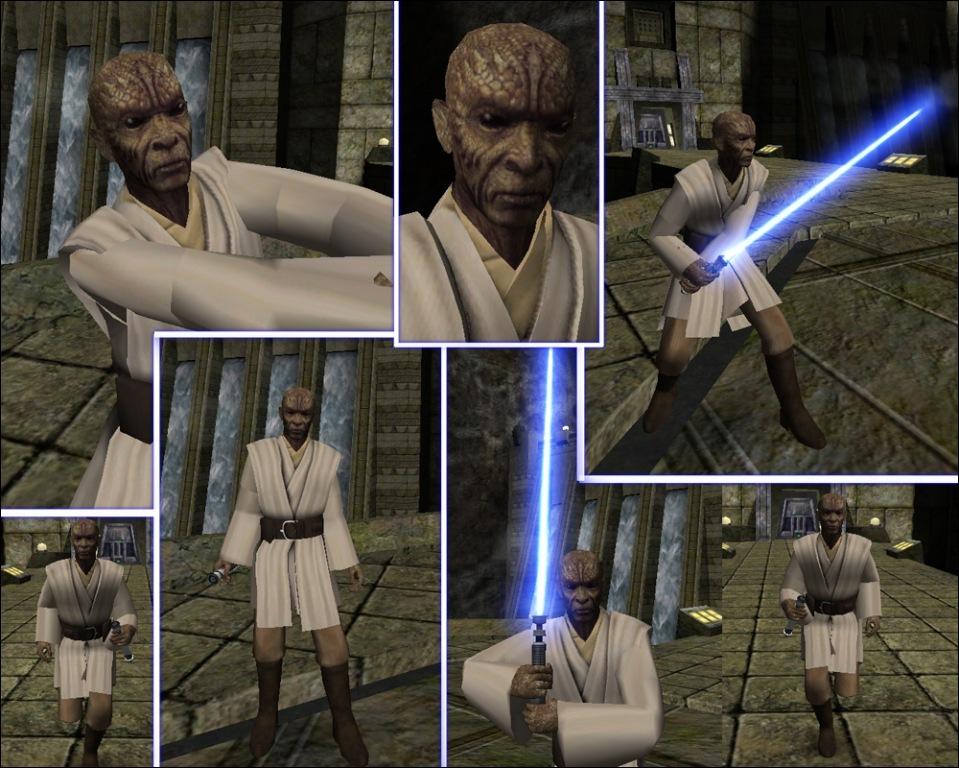 Kadas'sa'Nikto, or Green Nikto, were a Nikto subspecies, better known as few green skiff guards from Return Of The Jedi. This is your average green nikto in jedi robes, could be used either as random jedi or as any green nikto jedi (Drok, J'oopi Shé...) as niktos all tend to look very much the same. Sorry, no team colors but NPC file is included. I really would have wanted to skin red nikto but they dont have nose so skinning the face proved problematic. I actually requested nikto model back when JA was new, but to no avail, so here you go. Best I could do without nikto model.