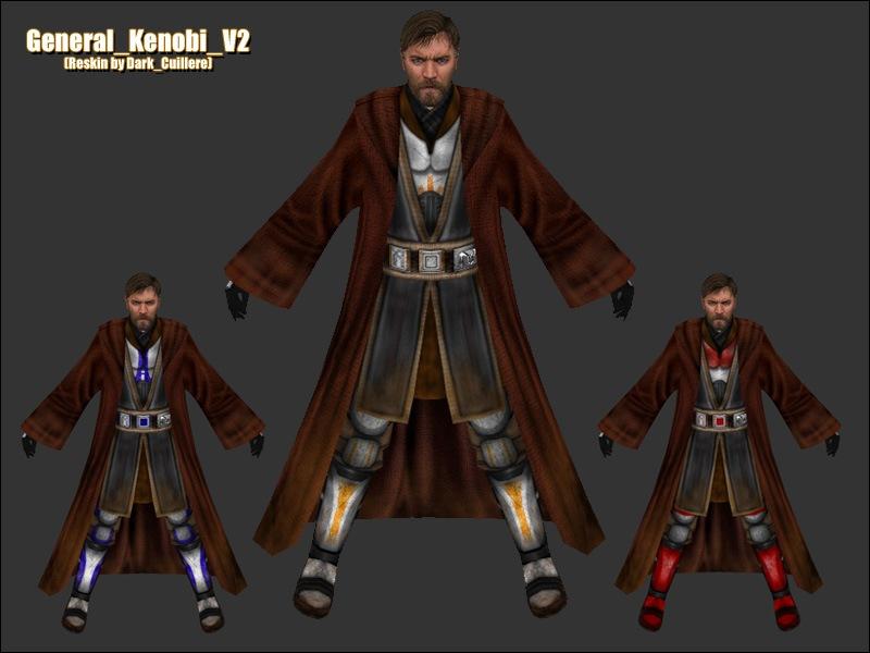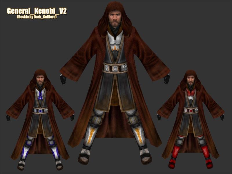 The first pk3 includes both Obi-Wan and his saber models. There are a total of 4 different texture sets in this pk3, the default, red & blue team skins, and then an alternate battle worn version as he appears on Mustafar during the final moments of the film.