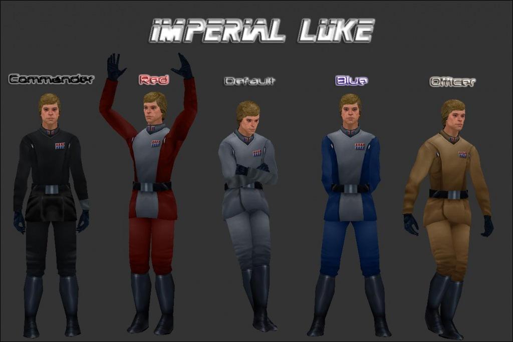 DESCRIPTION: This is Luke in the normal Imperial outfit. It has red and blue team skins, as well as the beige imperial officer, and black imperial commander clothes. I had to use the collar from the Galak model to replace lukes, which was recolored for the officer and commander skins.